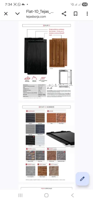 Lote de tejas planas marca Borja, modelo FLAT-10. - Color: negro - Modelo: FLAT-10. - Marca: Tejas Borja. - completamente nuevas, factura comora diciembre 2025 - Son de resto de obra se venden a 2 euros unidad y se deben pasar a recoger, dispongo de 490 unidades que serian para unos 49 m2 de techo