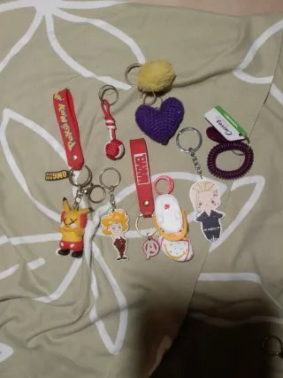 Lote de llaveros variados con diferentes diseños. - Llavero de Pikachu de Pokémon. - Llavero de Marvel. - Llavero con forma de corazón tejido. - Llavero con pompón amarillo. - Llavero con figura de personaje. - Llavero con resorte morado.