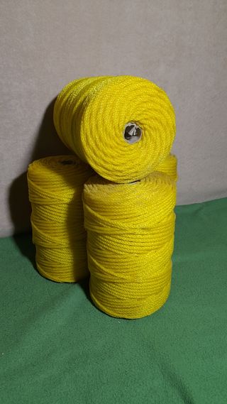 Se venden rollos de cuerda de polietileno de color amarillo. Composición 100% de alta tenacidad. Tejido con protección solar, sin absorción a humedad, cuerda trenzada a 4 cabos. Aplicaciones: Albañilería, jardinería, horticultura, bricolaje, manualidades, paquetería, náutica, deportes, toldos, camping, pesca, tendederos de ropa, cercados, persianas de cadenilla o alicantinas. - Cuerda de nylon. - Color amarillo. ROLLO AMARILLO DE 200 metros. Precio por unidad. Las fotos son parte de la descripción del artículo. Sólo se vende, no me interesan cambios. No se admiten devoluciones.