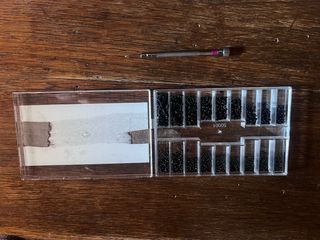 Vendo una caja con varios tornillos pequeños negros, ideal para reparaciones. - Incluye una gran variedad de tamaños. - La caja es de plástico transparente. - Se incluye un destornillador pequeño.