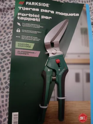 Tijeras de la marca Parkside diseñadas para cortar moqueta ,alfombras y cartón. - Mangos ergonómicos de 2 componentes. - Incluye bloqueo de seguridad. - Ajuste del tamaño de la mano.
