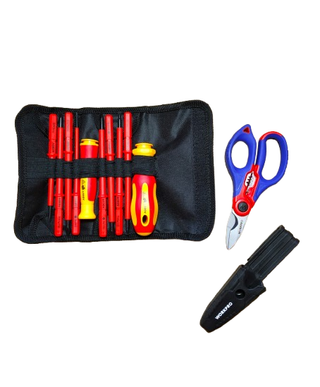 Funda enrollable de destornilladores aislados de Cr-V, para trabajos electricos hasta 500v, con 8 puntas imantadas intercambiables, mango ergonomico y mango de precisión. + Tijeras de elctricista en acero inoxidable WORKPRO, mango aislado y climpador. + Bolsa porta herramientas DELIXI de 24 x 14 x 14cm, de tela Oxtord, resistente e impermeable, con 2 asas, su tamaño compacto la hace útil para llevar en el coche. Todo nuevo.