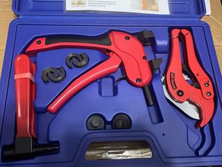 Se vende kit completo con herramienta para instalación de tuberías corredizas más cortatubos, comprado nuevo en Obramat. Ideal para fontanería, instalaciones de calefacción, agua, etc. Incluye: • Máquina manual para casquillos corredizos de 12-16-20 mm (mordaza / expandidor) — referencia Obramat: “Máquina manual 12-16-20 mm casquillo corredizo”, valorado en 107 € IVA incluido en su web.  • Tijera / cortatubos “Rocut Eco 42” con cuchilla en V, capacidad de corte hasta 42 mm — referencia Obramat “Tijera cortatubos 1-42 mm”, valorado en 8,72 € IVA incluido.  • Maletín rígido para transportar y guardar las herramientas. ✅ nuevo