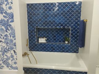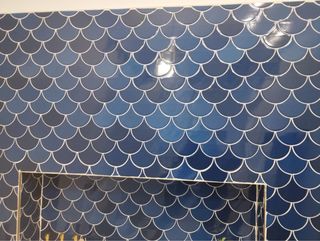 Conjunto de azulejos con un diseño único en forma de escamas y un degradado de tonos azules. 4 cajas de 45 piezas (30€ cada caja) 12'7*6'2 cada pieza - Diseño de escamas. - Tonos azules variados. - Acabado brillante.