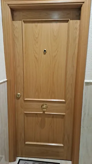 Puerta de entrada de piso, fabricada en madera. - Diseño clásico con paneles. - pomo. - Acabado en tono natural.