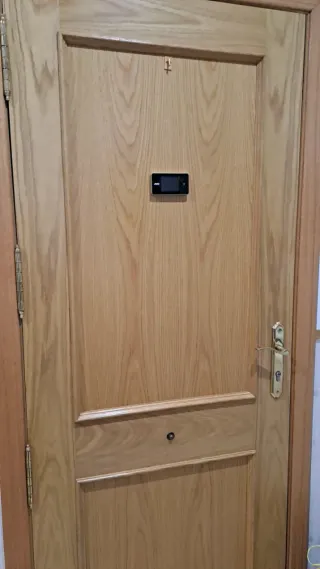 Puerta de interior de madera con diseño moderno. - Acabado en madera clara. - Tirador metálico. - Marco de madera a juego.