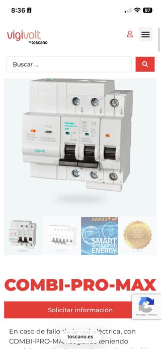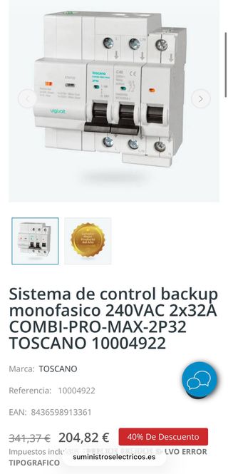 Sistema de control backup monofasico 240VAC 2x32A COMBI-PRO-MAX-2P32 TOSCANO 10004922 En caso de fallo de la red eléctrica, con COMBI-MAX seguirás teniendo suministro eléctrico gracias a tu instalación de autoconsumo. Hasta ahora, incluso con una instalación fotovoltaica operativa, en caso de caída de suministro de la red eléctrica, nuestra instalación perdía la capacidad de dar energía. Con COMBI-MAX ya no sufriremos cortes de suministro cuando la red eléctrica principal se caiga. Me queda una unidad disponible, precio por unidad. Dispongo de factura de compra. Esta en la caja a estrenar.
