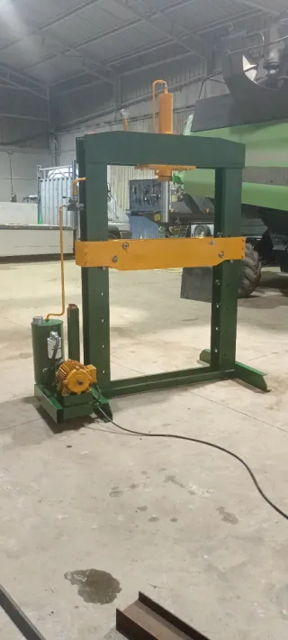 Prensa hidráulica robusta, ideal para talleres y aplicaciones industriales. Su estructura de metal verde y detalles en amarillo le dan un aspecto profesional. - Cilindro hidráulico. - Manómetro para control de presión. - Depósito de aceite verde.