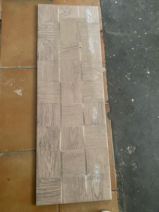 Azulejos con un diseño que imita la madera, creando un efecto parquet. - Acabado en tono madera clara. - Diseño cuadriculado.