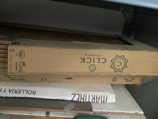 Baldosas de terrazo de color rojo, apiladas y sujetas con cintas de embalaje. Precio por m2 - Material: Terrazo. - Color: Rojo.