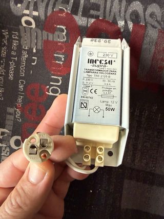 Transformadores (7) para lámparas halógenas marca INECSA SUPRA. - Modelo: TRE 2125-B - Voltaje primario: 230 V - Voltaje secundario: 11.2 V - Frecuencia: 50-60 Hz - Corriente: 3.9 A - Potencia máxima: 50W - Fabricado en España. ***Tengo en total 7 transformadores y las bombillas led de las fotos (nuevas y seminuevas). PRECIO 2€ la unidad