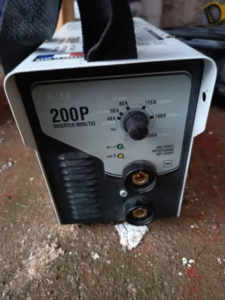 Soldador Inverter 200P para MMA y TIG. - Modelo: 200P - Tipo: Inverter MMA/TIG - Rango de amperaje: 10A - 200A - Indicadores LED de ON, STOP y fallo. - Conexiones para pinza porta electrodo y masa.