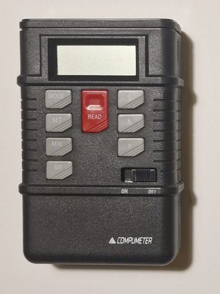 Medidor de distancia LÁSER, marca Compumeter, para 12,5 mt. Mide distancias, áreas y volúmenes de manera precisa y rápida. Teclas "MODE" (modo), "SET" (configurar), "MIN" (mínimo), "MR" (memoria de lectura) y "READ" (lectura). Pantalla digital que muestra las mediciones. Interruptor en la parte inferior. Estos medidores láser son una alternativa a las cintas métricas tradicionales, siedo muy útiles tanto para aficionados al bricolaje como para profesionales de decoración, lampistería, albañilería, mobiliario, etc.... Sólo se utilizó unos pocos días. Más de 100 productos y herramientas mi perfil!!!