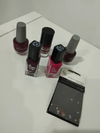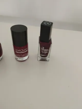 Lote de cuatro pintauñas de diferentes marcas y tonos.el fucsia está un poco utilizado. - Dos pintauñas de la marca Cosmetica. - Un pintauñas de la marca PostQuam. - Un pintauñas de la marca Peggy Sage. - Tonos burdeos y rojizos.