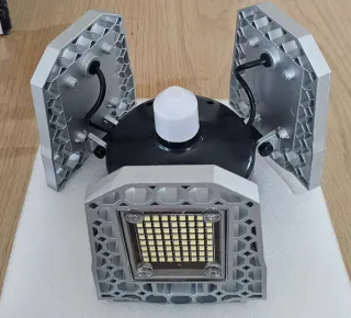 Luz LED de alto rendimiento para garajes o espacios amplios. Su diseño permite ajustar la orientación de los paneles para dirigir la luz. - Potencia: 60W. - Casquillo: E27. - Diseño con 3 paneles ajustables. - Material: Aluminio y plástico.