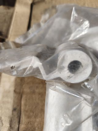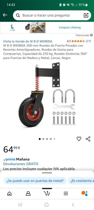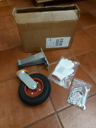Rueda de goma de 20cm de diametro para puerta batiente, con soporte metálico y amortiguador. Está por estrenar, nunca se llegó a utilizar.