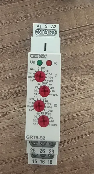 Relé temporizador Geya GRT8-S2 con función de ciclo asimétrico. Diseñado para aplicaciones de control de tiempo. - Modelo: GRT8-S2 - Marca: GEYA - Tipo: Relé temporizador de ciclo asimétrico - Indicadores LED: Un (verde), R (rojo) - Terminales de conexión: A1, S, A2, 15, 16, 18, 25, 26, 28