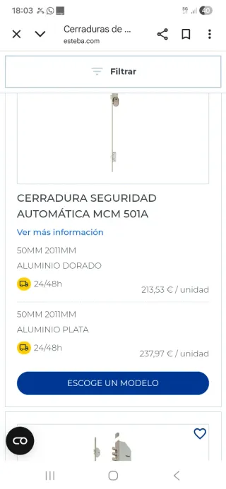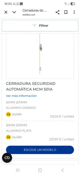 Cerradura de seguridad automática MCM 501A. - Modelo: MCM 501A - Medida: 50MM 2011MM - Acabado: Aluminio Dorado - Envío: 24/48h - Precio: 213,53 € / unidad - Medida: 50MM 2011MM - Acabado: Aluminio Plata - Envío: 24/48h - Precio: 237,97 € / unidad