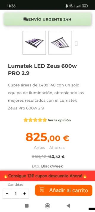Equipo de iluminación Lumatek LED Zeus 600w PRO 2.9. - Cubre áreas de 1.40x1.40. - Ideal para obtener los mejores resultados. - Dto. BlackWeek.