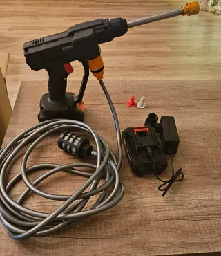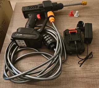 Hidrolimpiadora inalámbrica con batería de litio. - Presión: 60 Bar - Potencia: 300W - Incluye filtro de agua - Boquillas intercambiables - Control 2 baterías 21v
