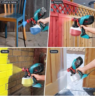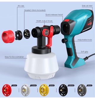 Pistola de pintura eléctrica Enemc con contenedor. - Incluye 5 boquillas de diferentes tamaños (1mm, 1.5mm, 2mm, 2.5mm, 3mm). - Air cap. - Quick release head. - Width Adjust Knob. - Easy-To-Go container. - Side air inlet. - Adjustable knob. - Soft grip.