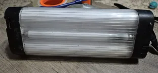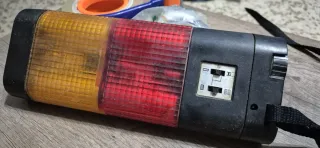 Linterna con luces de colores naranja y roja. - Carcasa de plástico negro. - Correa de sujeción. - Interruptores de control.