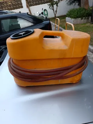 Descalcificadora de plástico de color naranja con capacidad de 20 litros. Incluye una manguera enrollada. - Capacidad: 20L - Material: Plástico - Color: Naranja - Incluye manguera