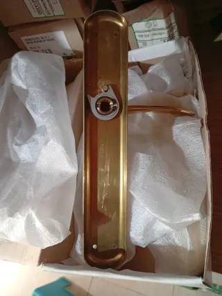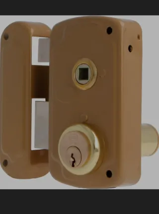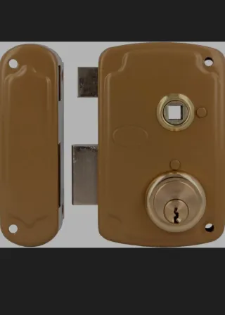 Cerradura de seguridad con acabado en color dorado. Incluye la cerradura principal y su placa. - Mecanismo de doble vuelta. - Cilindro de alta seguridad. - Diseño robusto y duradero. -Cerradura de Sobreponer de Izquierda con Palanca de Cierre y Lengüeta para Puertas de Madera Mod. 75UN 76 x 120 mm Cilindro .