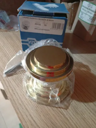 Pomo de puerta con roseta en acabado latón brillo satinado. - Diámetro de la roseta: 90mm. - Modelo PP70. - Acabado: Brillo satinado.