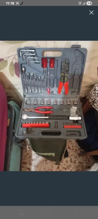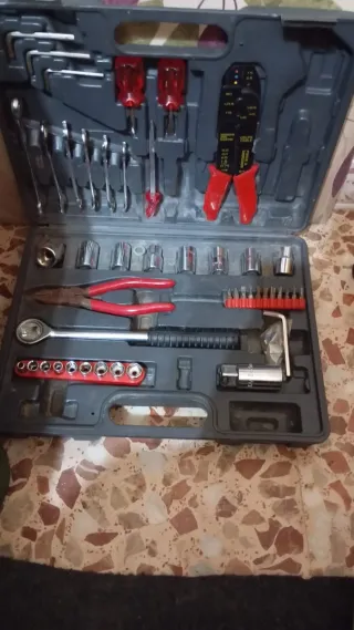 Maletín de herramientas con variedad de piezas. - Incluye llaves Allen, destornilladores y alicates. - Contiene vasos de diferentes tamaños. - Incluye herramienta para crimpar.