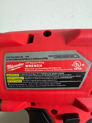 Llave de cuadradillo Milwaukee de 18V. - Modelo: 2855-20 - Velocidad: 80-3300 RPM / 0-4500 IPM - Serie: H98AD204501983 - Fabricada profesionalmente en China por Milwaukee Tool. - Requiere cargadores MILWAUKEE M18 Lithium-ion. - 300NM par de apriete