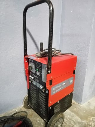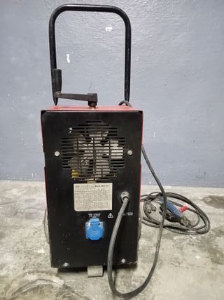 Soldadora eléctrica marca JLC, modelo Nuevo Mini 140. Equipo de soldadura portátil con ruedas. - Color rojo y negro. - Asa de transporte. - Panel de control con selector de potencia y luces indicadoras.