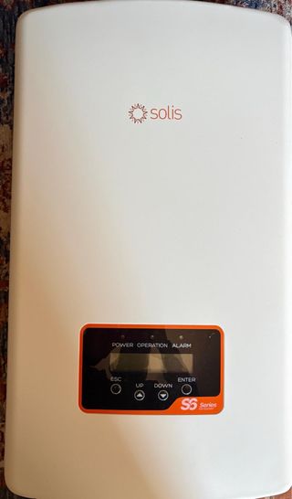 Inversor de la marca Solis, modelo S5 Series. Dispone de pantalla LCD y botones de control. - Indicadores LED de Power, Operation y Alarm. - Botones: ESC, UP, DOWN, ENTER. - Diseño en color blanco.