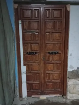 Puerta doble de madera con un diseño clásico y robusto. Ideal para dar un toque rústico y elegante a tu hogar. - Fabricada en madera maciza. - Diseño con paneles tallados. - Incluye tiradores ornamentales.