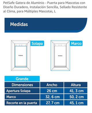 Puerta para mascotas de la marca PetSafe, ideal para exteriores. Es el tamaño L para perros medianos. Me equivoqué de talla y por eso lo vendo nuevo. - Marco blanco. - Flap translúcido. - Diseño para instalación en puertas.