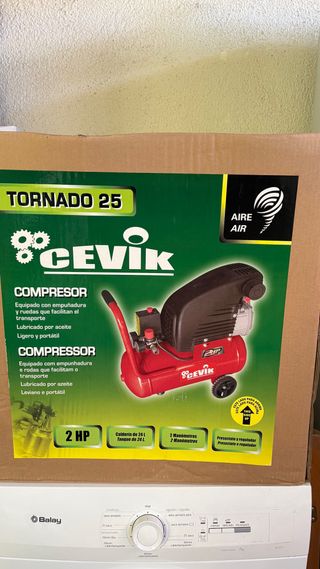 Compresor de aire marca Cevik, modelo Tornado 25. Está en perfecto estado, sin uso. - Capacidad del calderín: 24 L. - Potencia: 2 HP. - Incluye 2 manómetros. - Lubricado por aceite. - Diseño ligero y portátil con empuñadura y ruedas.