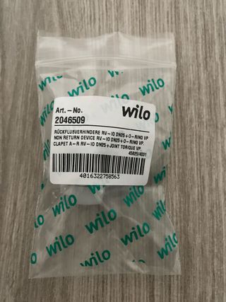 Válvula antiretorno Wilo. - Modelo: RV-10 DN25+0-RING VP. - Referencia: 2046509. - Código de barras: 4016322758563. - Código de producto: 45825/4031. Sistemas de recirculacion de agua