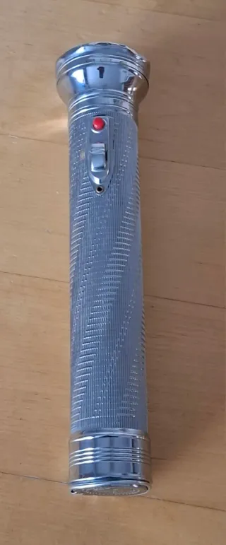 Linterna de color plateado con un diseño clásico de los años 70. - Cuerpo metálico. - Reflector brillante. - Interruptor de encendido/apagado/señales morse. - Pulsador rojo para señales morse. - Con gancho para colgar. - Funciona con 3 pilas LR20 (NO INCLUIDAS). - Medidas 23 x 5 cm
