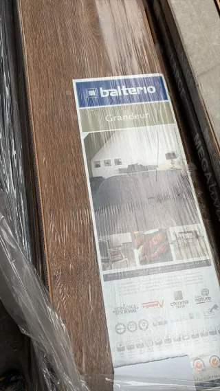 Tarima vinílica con acabado imitación madera. - 12 metros tarima vinílica. - Diseño de vetas grises y marrones. - Ideal para suelos.