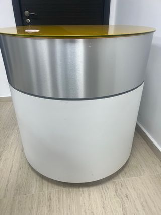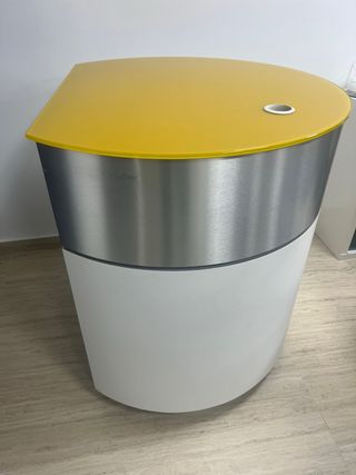 Mostrador con un diseño moderno y curvo, ideal para recepciones o espacios comerciales. - Tapa superior de color amarillo. - Cuerpo principal en acabado plateado. - Base inferior de color blanco. - no hago envia
