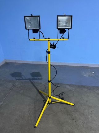 Conjunto de 2 focos halógenos de 500W cada uno, montados en pie soporte extensible, nuevos, sin estrenar. Características: • 2 focos halógenos de 500W (potencia total 1000W) • Montados en trípode metálico regulable • Altura máxima aprox. 1,90 m • El pie se pliega y se recoge fácilmente • Perfectos para iluminar zonas de trabajo, obras, garaje, exterior, etc. Estado: nuevos, nunca usados, solo guardados.