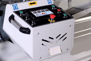 Tronzadora para aluminio de la marca Codimsa. Con carro - Interruptor general. - Pulsador verde. - Pulsador rojo. - Piloto.