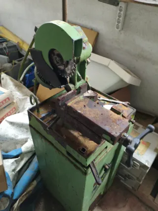 TELÉFONO DE CONTACTO: 624 16 79 64 Tronzadora para cortar hierro, dispone de mordaza, y se puede regular para cortes en inglete/angulo. Ideal para pequeños y medianos trabajos de cerrajería. Para cosas más grandes es conveniente ir a una sierra de cinta porque esta no sirve para cosas que requieran de mucha apertura en la mordaza. Con refrigeración por agua con taladrina. Trifásica a 220v y 380v. La tengo en Elche.