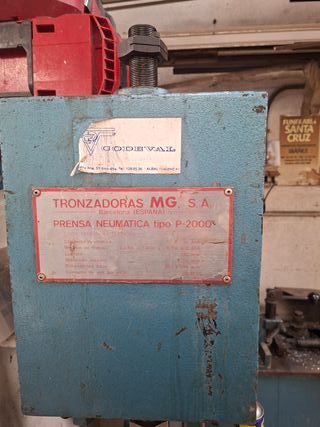 Prensa troqueladora marca MG, modelo P-3300. Ideal para trabajos de corte y conformado. - Presión de trabajo: 6-8 atm. - Fuerza: 3,3 Ton. Precio rebajado llevandose tronzadora, prensa, copiadora y dos mesas de trabajo