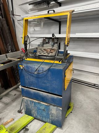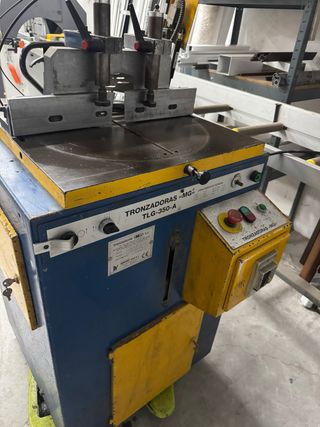Se vende una tronzadora de aluminio TLG-350A en buen estado. Es una máquina robusta y aparentemente bien cuidada. - Modelo: TLG-350A - Marca: MG - Para aluminio - Color azul y amarillo