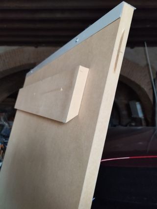 12 tableros de DM de 1885x770x19mm con machihembrado para su posible empalme en los lados largos. Por una de sus caras tienen 3 listones de sujeción con diferentes posibles usos. 6 de ellos están canteados por angulares de aluminio blanco en sus lados cortos, los otros 6 tienen además canteado un lado largo. Se incluyen 16m aprox de listones para sujeción a pared. Se entregan a nivel de calle.