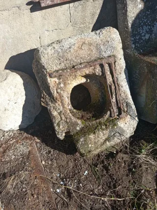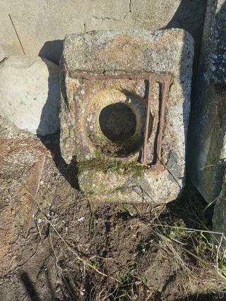 Pieza de cantería antigua con un orificio circular y estructura metálica. - Material: Piedra. - Elemento de desagüe o drenaje. - Con detalles de metal oxidado.