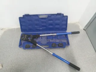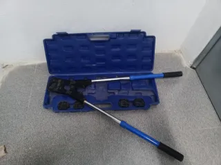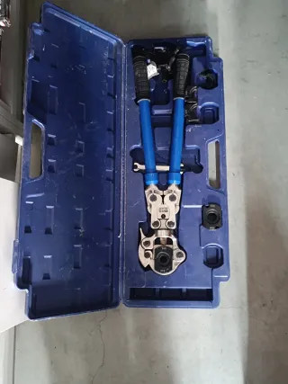 Herramienta de prensa manual para instalaciones de tuberías. Viene en su maletín original. - Incluye juego de mordazas. - Maletín de transporte azul.