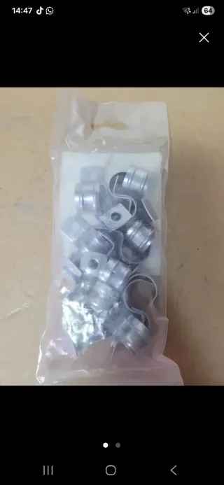 Se venden 10 paquetes de grapas para tubería. Son de metal plateado y vienen en su empaque original. - Material: Metal - Color: Plateado - Cantidad: 10 paquetes