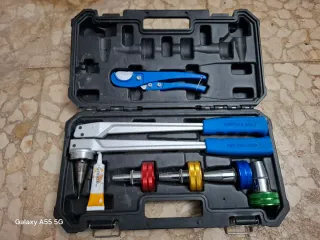 Kit de abocardador para tuberías de aire acondicionado. - Incluye diferentes tamaños de boquillas. - Herramienta para crear abocardados en tubos de cobre. - En su maletin.